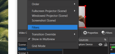 Nama fungsi dalam OBS adalah filter untuk memulai pengaturan latar belakang Transparan, lihat gambar di bawah ini.