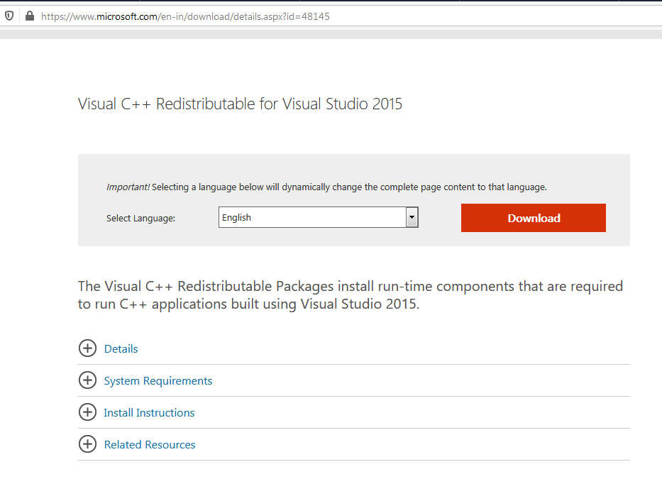 Mendownload secara manual Visual C++ Redistributable untuk Visual Studio 2015 langsung dari situs Microsoft