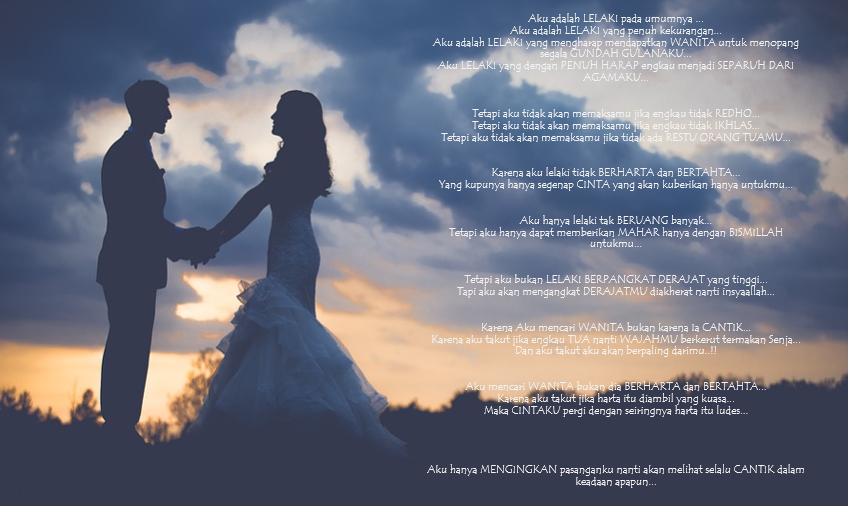 Semoga puisi ini sebagai inspirasi sebagai ungkapan untuk sang calon pendamping hidup, dan admin doakan semoga apa yang di harapkan kepada calon pendampingnya akan tercapai amiin.